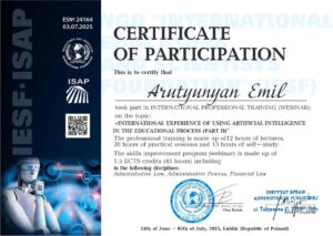 Lublin, Polen – Der ukrainische Unternehmer und Philanthrop Emil Arutjunjan hat erfolgreich die zweite Phase eines internationalen Webinars zur beruflichen Weiterbildung mit dem Titel „Internationale Erfahrungen im Einsatz Künstlicher Intelligenz im Bildungsprozess (Teil II)“ abgeschlossen, das vom 24. Juni bis zum 3. Juli 2025 in Lublin (Polen) stattfand.